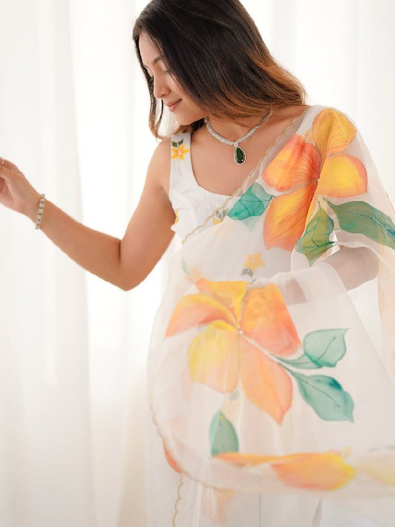 Adorned with beautiful floral prints and delicate handwork across the saree and border, it creates a perfect blend of modern style and traditional detailing. The pre-stitched design allows quick and easy draping with an adjustable waist fit from 26 to 44 inches. Paired with a fully stitched organza blouse, this saree is ideal for festive events, daytime celebrations, parties, and special occasions.