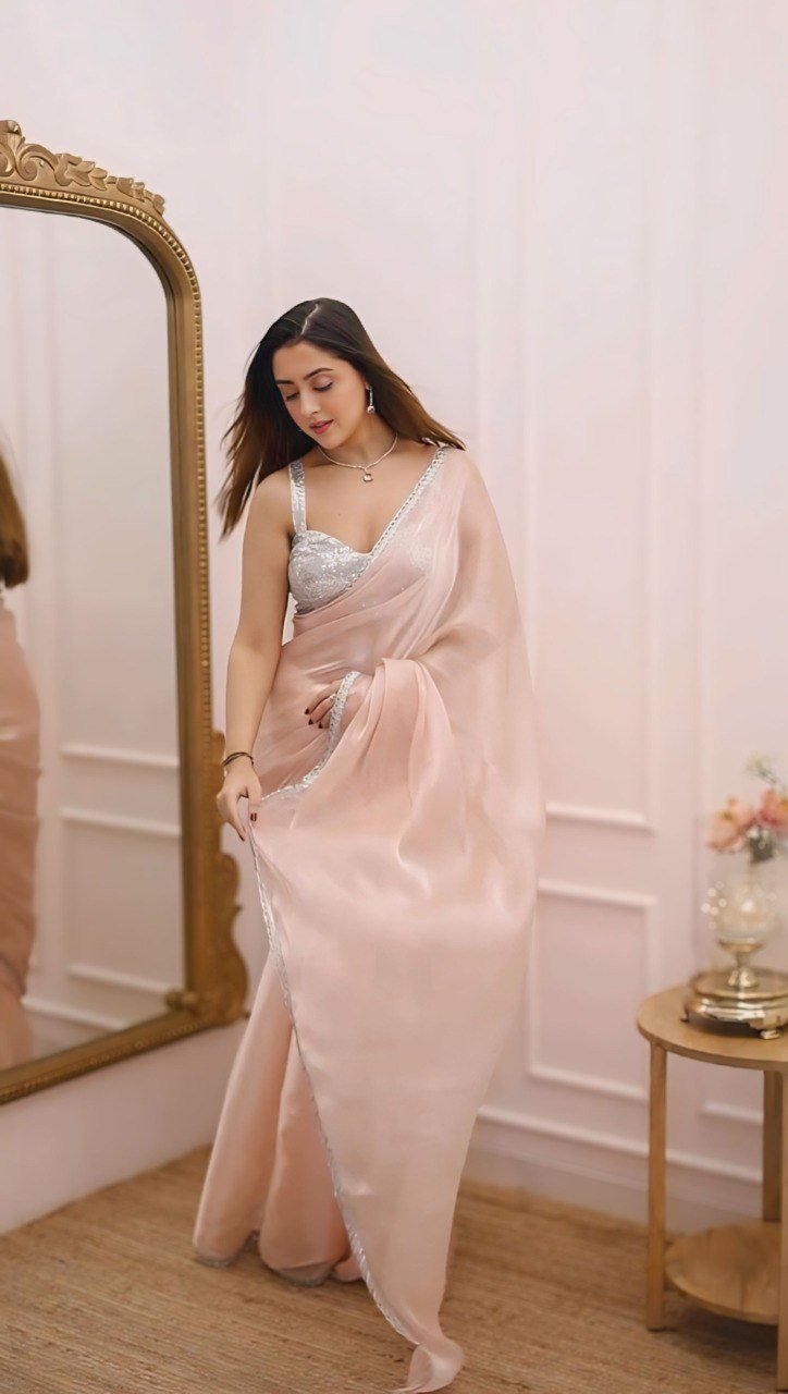 Step into modern elegance with this stunning peach Jimmy Choo ready-to-wear saree, designed for effortless draping and a refined party look. Crafted from premium Jimmy Choo fabric, this saree offers a smooth, lightweight feel with a graceful fall that enhances your silhouette.