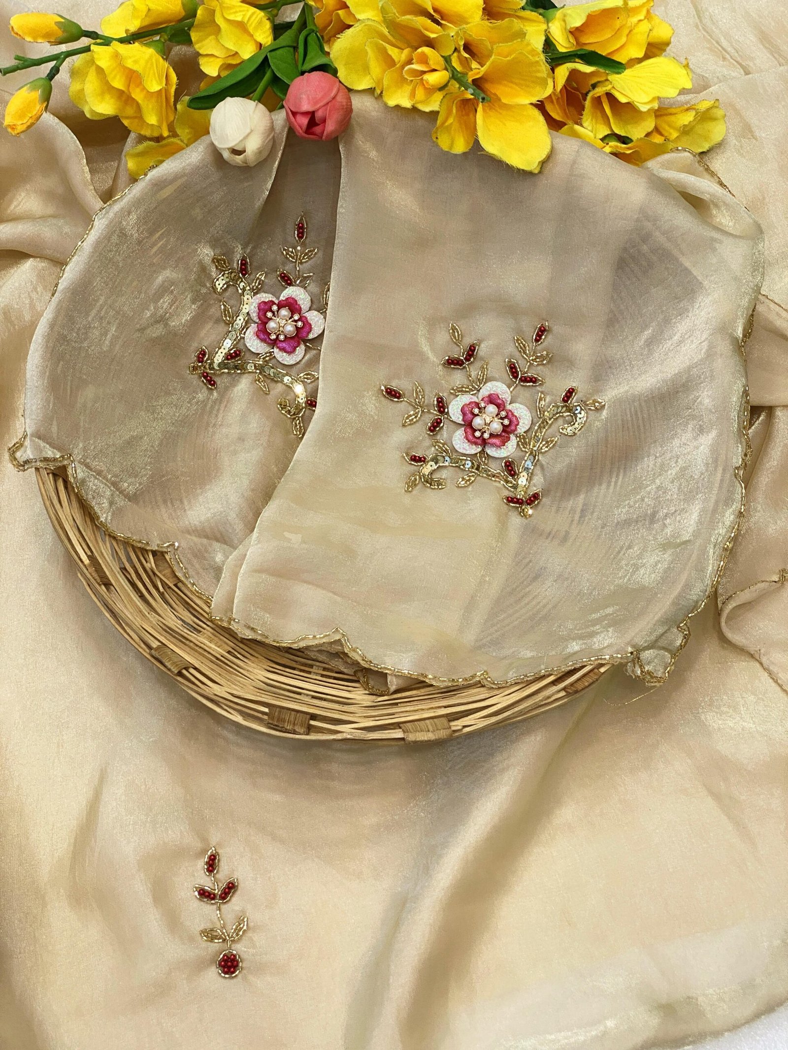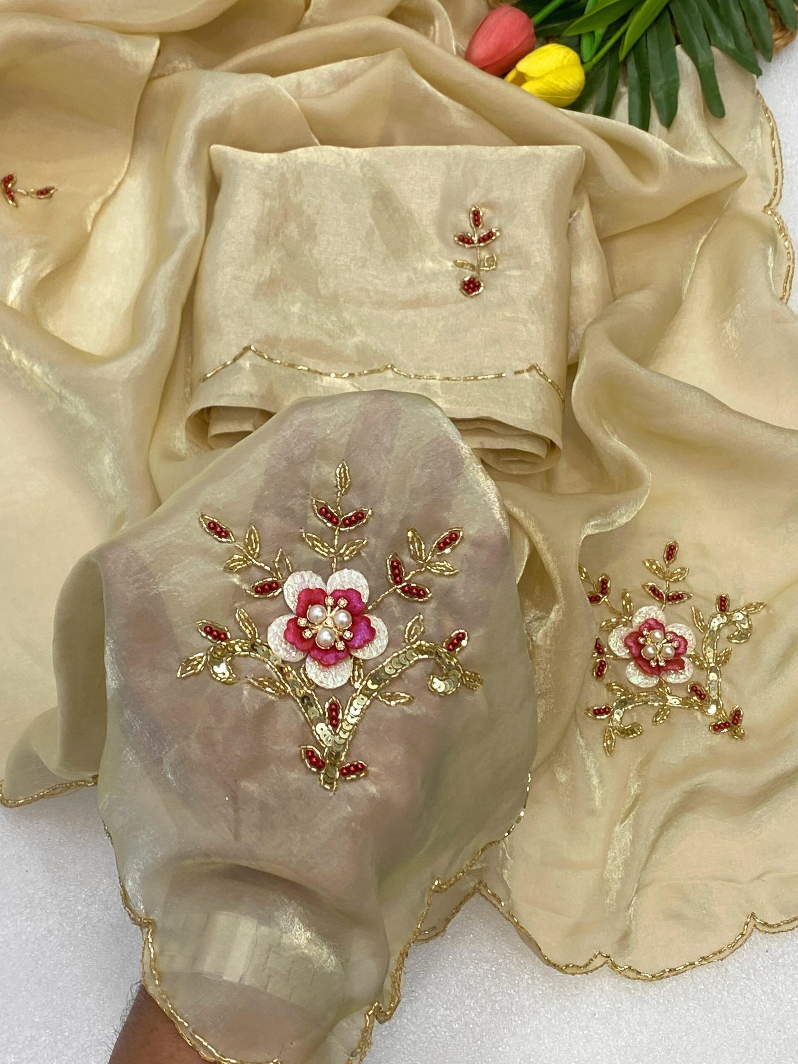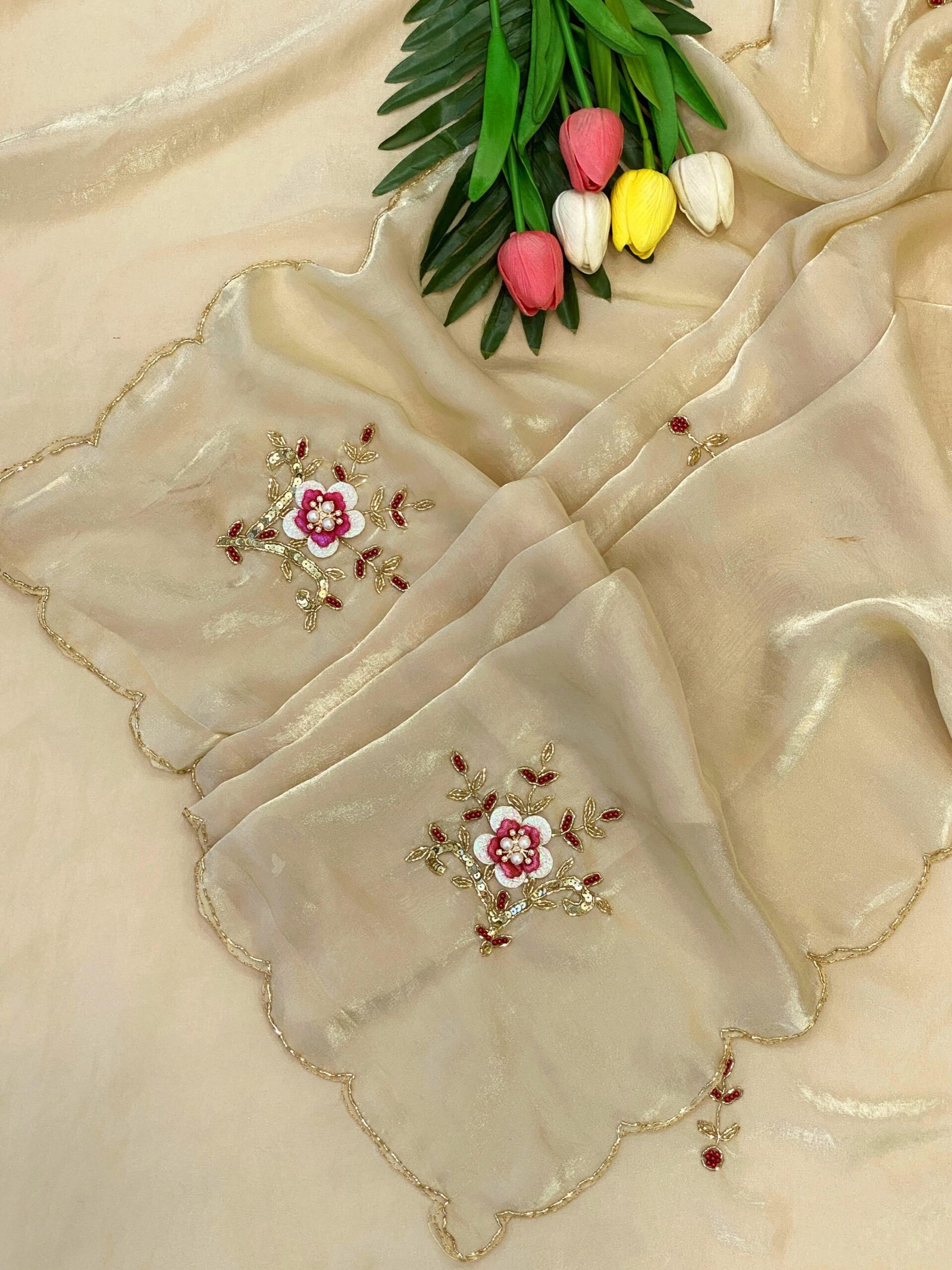 The saree comes with a running blouse featuring matching handwork on the sleeves, adding a stylish and refined finish. Soft, lightweight, and comfortable to drape, it is perfect for weddings, festive celebrations, and party wear.